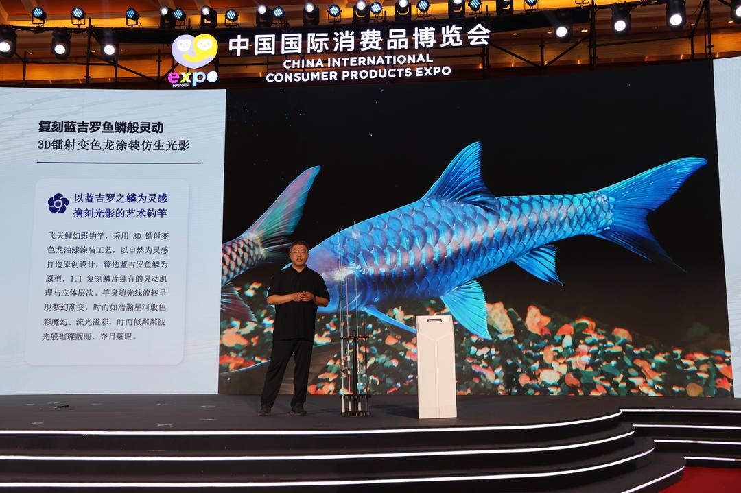 4月13日,2026消博新品秀在海南國際會展中心迎賓大廳開展。山東知名商標企業威海怡隆漁具有限公司在省市專場進行新品發布,帶來飛天鯉·幻影、甲骨文·Ⅱ代等臺釣系列產品和鈞天·覓龍、鈞天·銀棍等多款海釣系列產品。