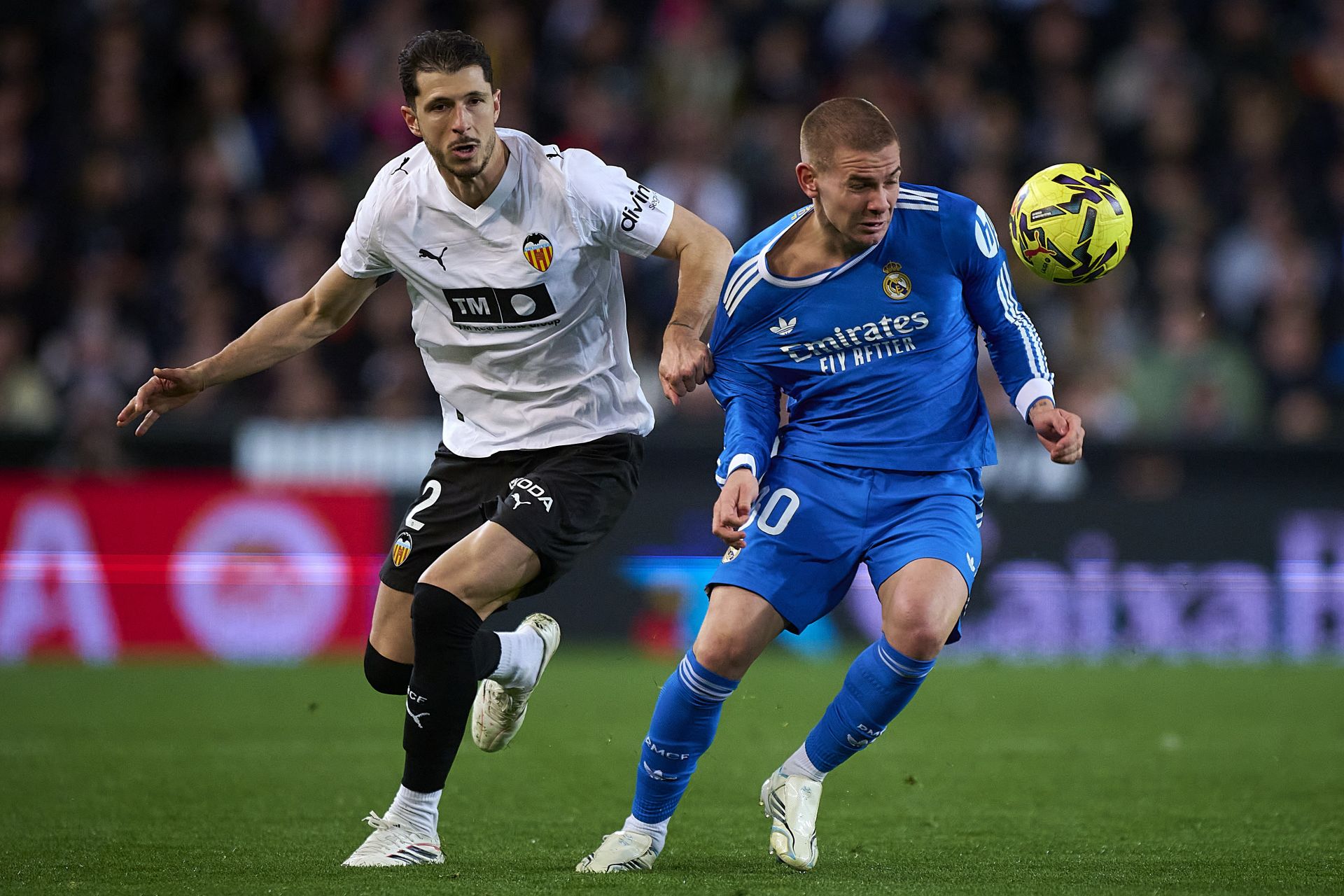 2月8日,瓦倫西亞隊球員羅德里格斯(左)與皇家馬德里隊球員馬斯坦托諾在比賽中拼搶。