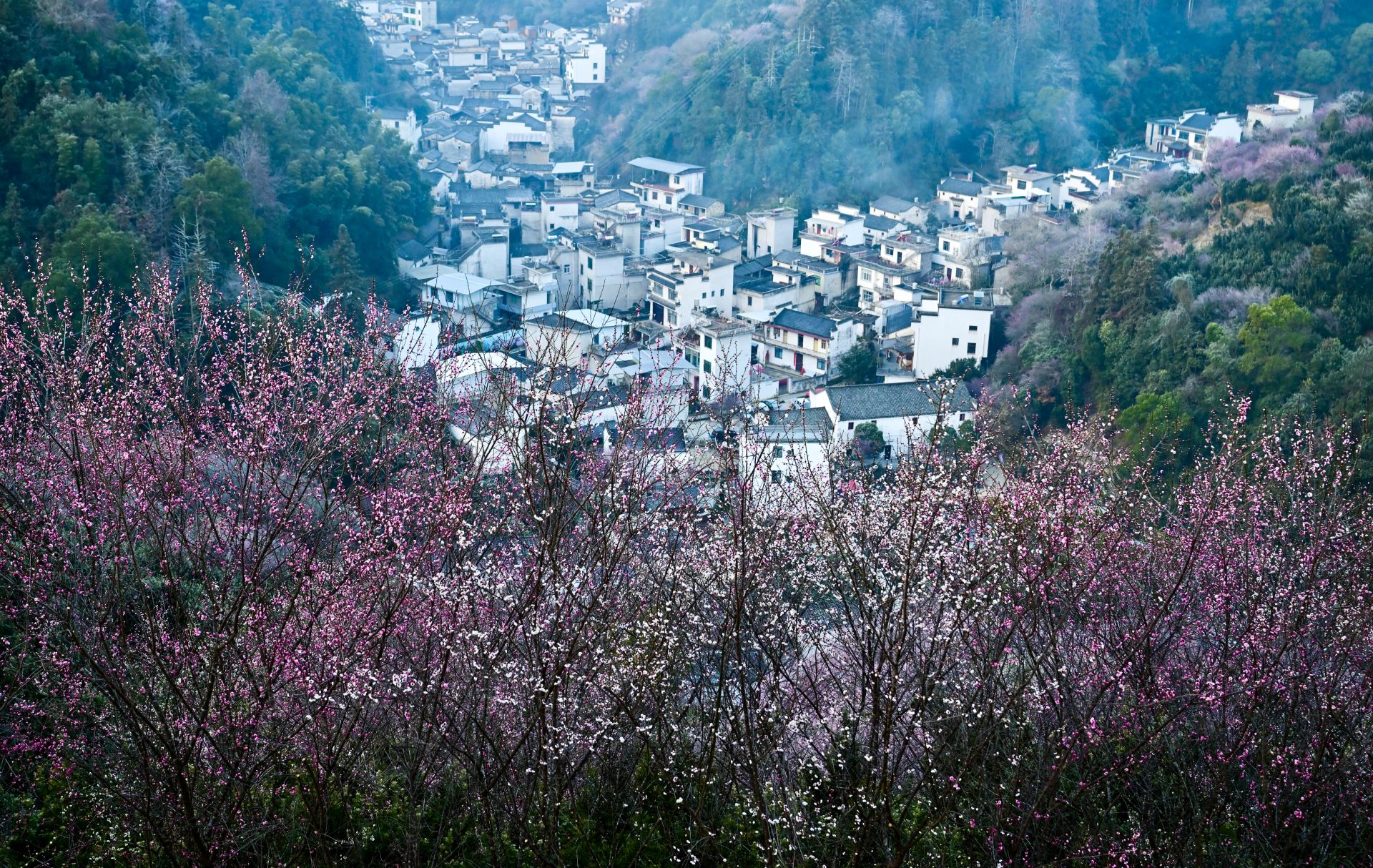 近日,在安徽省黃山市歙縣雄村鎮(zhèn)賣花漁村,漫山遍野的梅花綻放,花海與徽派村落民居相映成趣,景美如畫。