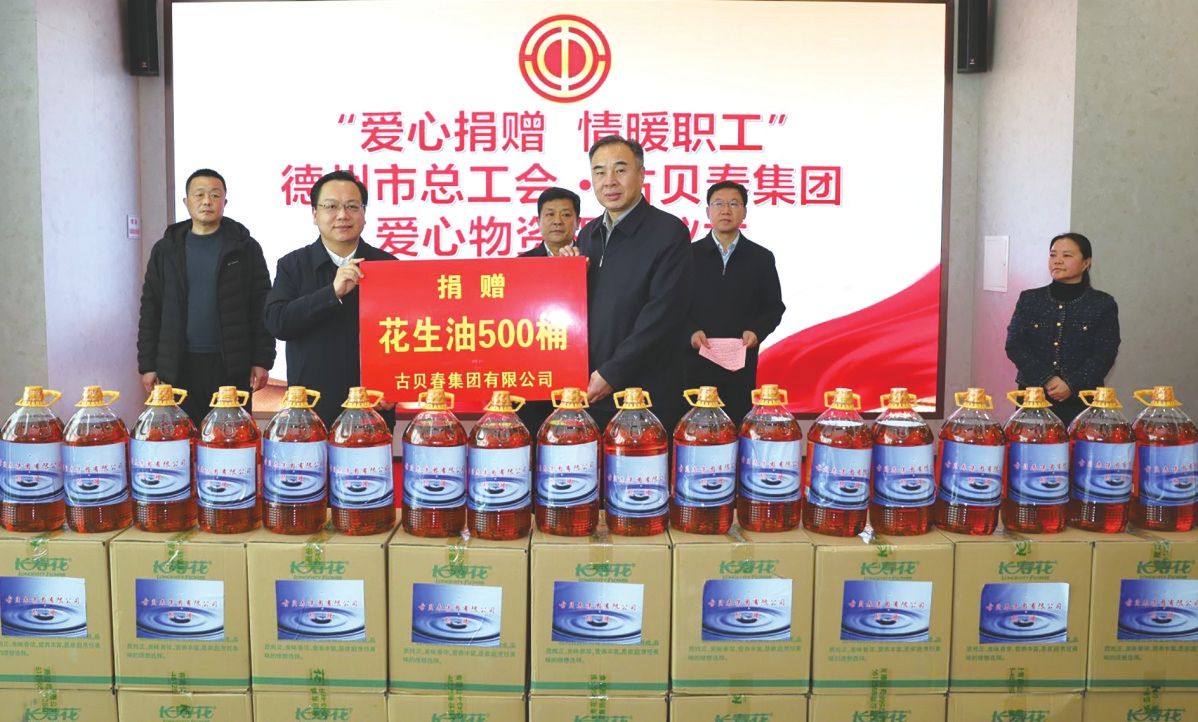 2月5日下午,“愛心捐贈情暖職工”德州市總工會·古貝春集團愛心物資捐贈儀式在德州市職工服務中心舉行。儀式上,古貝春集團總經理張洪昌代表集團向一線職工捐贈500桶食用油,這也是該集團連續21年為困難職工捐贈物資。本次活動共有市直在檔困難職工、新就業形態職工、園林綠化及公安交警一線職工代表50余人參加。