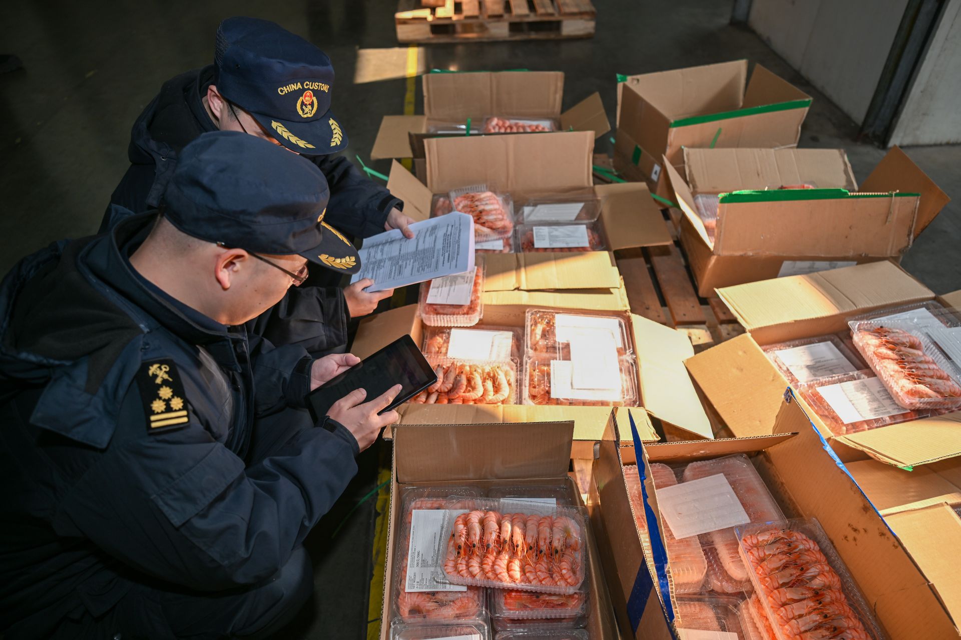 2月11日,在天津港首農(nóng)食品進(jìn)出口貿(mào)易有限公司進(jìn)境肉類指定監(jiān)管場地,天津東疆海關(guān)現(xiàn)場查驗(yàn)關(guān)員開箱檢查進(jìn)口生鮮產(chǎn)品。