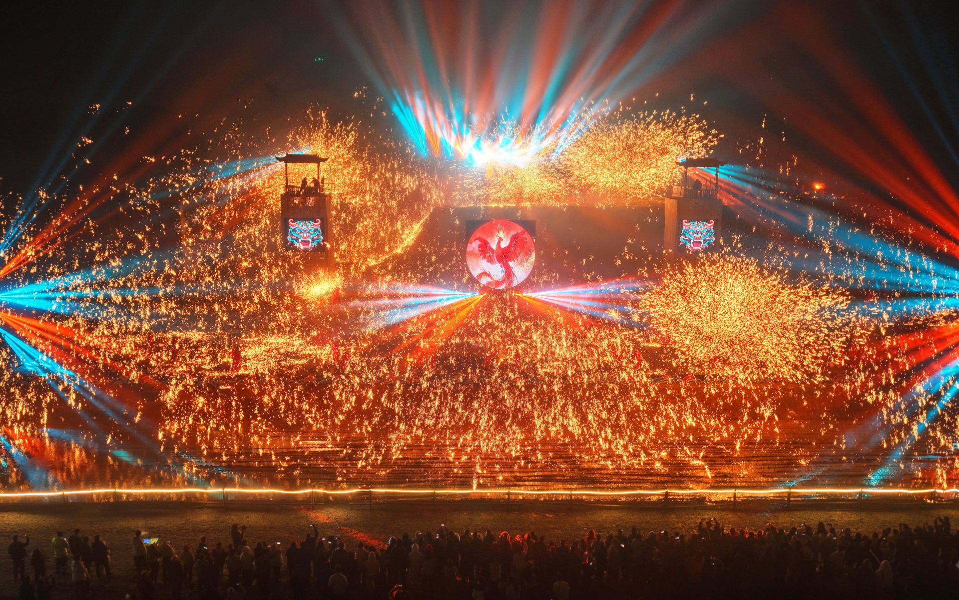 2月13日,在湖南省衡陽市南岳區1944景區,民間藝人表演打鐵花(無人機照片)。