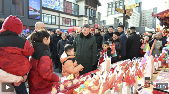總書(shū)記察看街區(qū)風(fēng)貌和各式年貨攤位,同現(xiàn)場(chǎng)群眾親切交流。他愉快地向大家講起年少時(shí)多次到隆福寺的情景,還購(gòu)買(mǎi)了特色食品和文創(chuàng)產(chǎn)品。